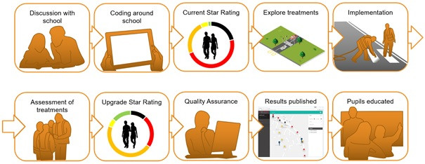 Víme, které prvky ovlivňují bezpečnost chodců na cestě do školy. Pomocí výzkumu jejich dopadu na bezpečnost se vypočítá hodnocení pomocí hvězdiček, kdy 1 hvězdička znamená nejméně bezpečné a 5 hvězdiček maximálně bezpečné. Nástroj SR4S kombinuje centrální webovou aplikaci a aplikaci pro sběr dat pro Android, využívající potenciál hodnocení iRAP Star Rating pro chodce.