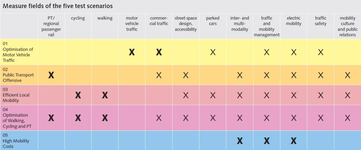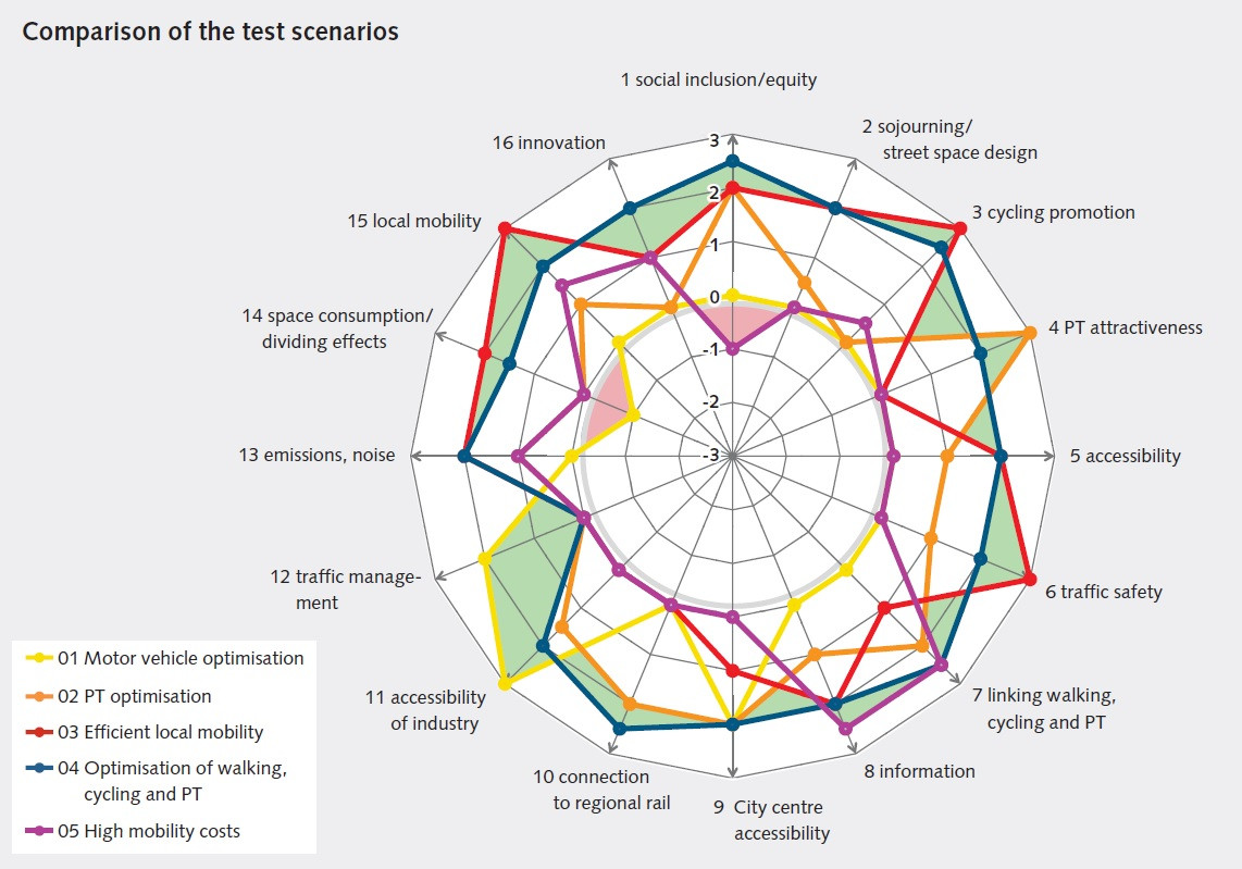 Silné stránky každého testovacího scénáře lze určit s ohledem na úspěšnost scénáře a jeho balíčku opatření. Testovací scénář 02 „Veřejná doprava útočí“ má zvlášť silný dopad v případě indikátoru „atraktivita veřejné dopravy“, který lze vysledovat mj. jiné až k opatřením pro intenzivní rozšíření služeb veřejné dopravy. Testovací scénář 03 „Efektivní místní mobilita“ se svým zaměřením na pěší a cyklistickou dopravu, bezpečnost a rozšíření zón s rychlostí do 30 km/h vykazuje mimořádný účinek především pro indikátory „místní mobilita“, „podpora a propagace cyklistické dopravy“ a „bezpečnost dopravního provozu“. Pouze testovací scénář 04 „Optimalizace pěší, cyklistické a veřejné dopravy“ vykazuje podobně výrazný účinek pro téměř všechny indikátory. Testovací scénář 01 „Optimalizace motorové dopravy“ vyniká mezi ostatními jako jediný scénář s výrazným dopadem na indikátor „řízení dopravy“. Pro indikátor „dostupnost průmyslových a obchodních zón“ je posílením především koncentrace infrastrukturních opatření a optimalizace dopravního provozu na silniční síti. Silné stránky testovacího scénáře 05 „Vysoké náklady na mobilitu“, který počítá s adaptačními strategiemi, vycházejícími z neúměrně zvýšených nákladů na mobilitu, vyniká především v indikátorech „informace“ a „propojení pěší, cyklistické a veřejné dopravy“, protože tento scénář zahrnuje místo investičních opatření zajištění informačních řešení a různých možností mobility.
