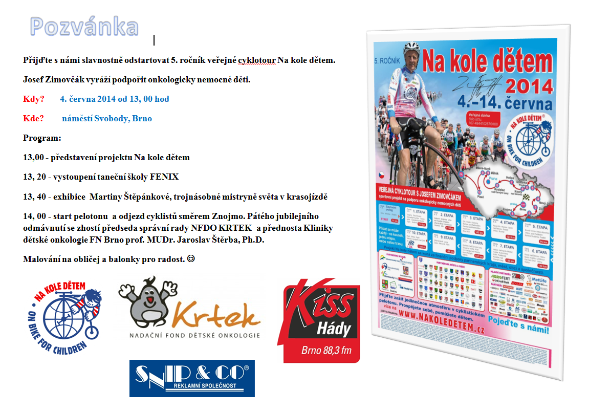 Josef Zimovčák, vedoucí projektu Na kole dětem, nás srdečné zve k aktivní účasti v pelotonu 5. ročníku veřejné cyklotour Na kole dětem, či setkání s účastníky cyklotour na některém z náměstí, kde peloton cyklistů zastaví. Podrobný popis trasy najdete na http://www.nakoledetem.cz/cyklotour.
