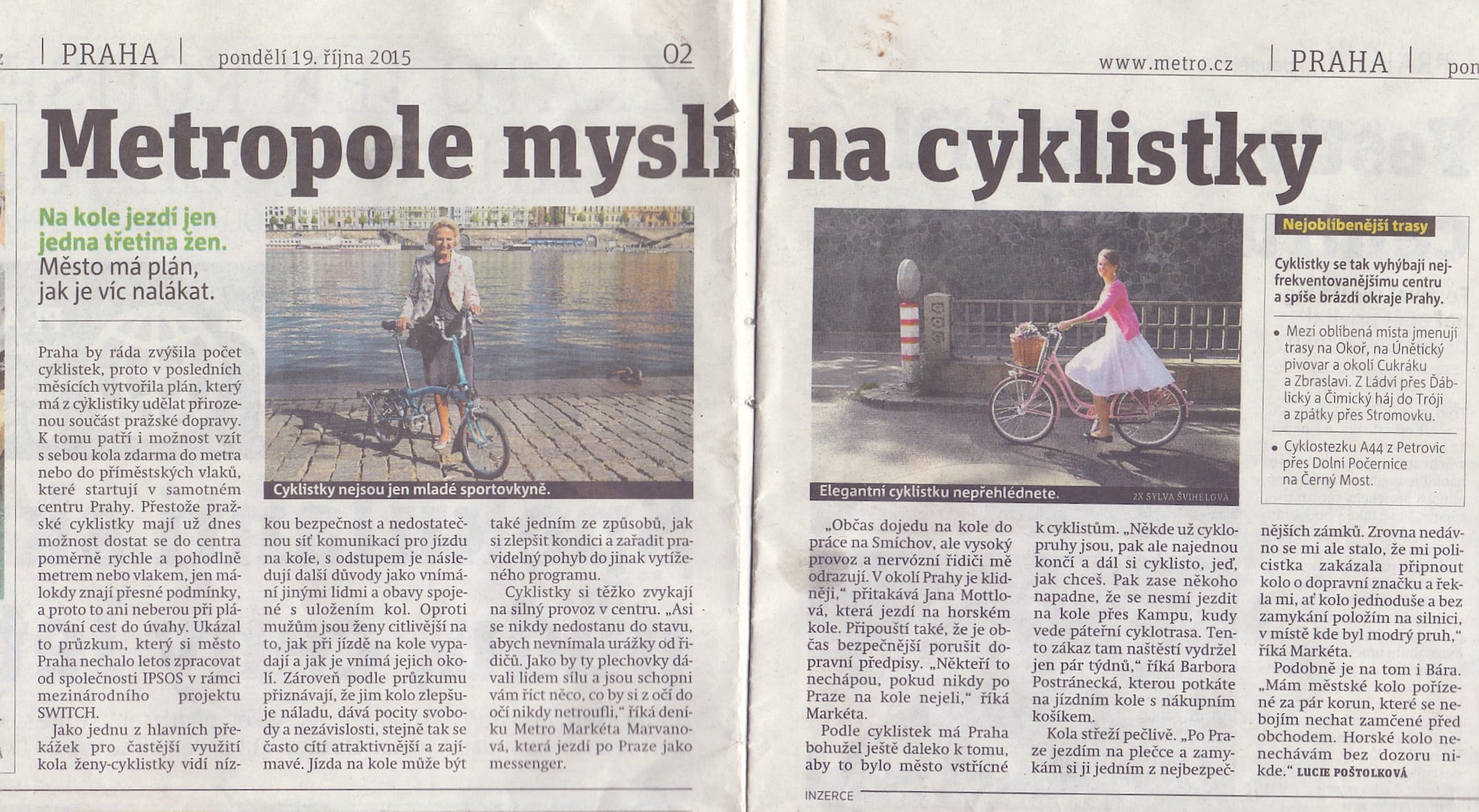 Na kole jezdí jen jedna třetina žen. Jak se žije ženám-cyklistkám v Praze? Deník Metro v dnešním vydání popisuje, co ženy potřebují a jak se jim jezdí v Praze na kole. Usnadnit jim cestu přes metropoli by měla v budoucnosti řada opatření, která plánuje město.