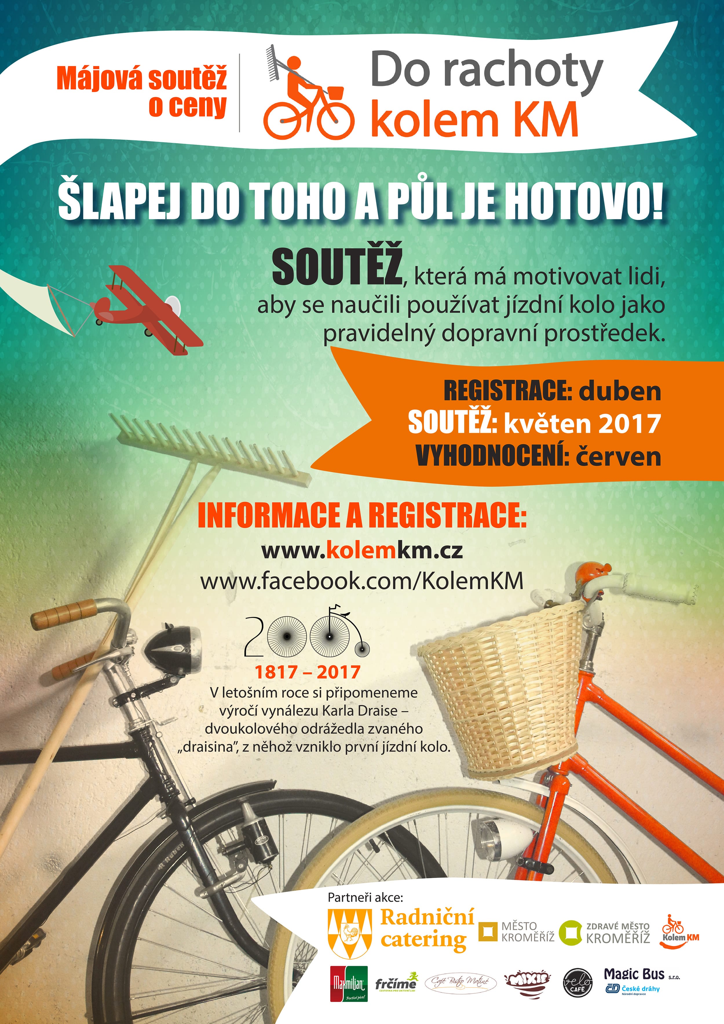 Po celý květen budou mít Kroměřížané možnost soutěžit v rámci kampaně Do rachoty Kolem KM, kterou pořádají město Kroměříž a spolek Kolem KM. Kampaň je určena na podporu pohybových aktivit v každodenním životě a je místní obdobou kampaně Do práce na kole. Na výherce ve čtyřech kategoriích čekají atraktivní ceny od sponzorů. Více informací včetně pravidel najdete na adrese www.kolemkm.cz, kde se můžete do konce dubna zaregistrovat. Vyhlášení výherců proběhne na Vybarveném běhu 10. června 2017.