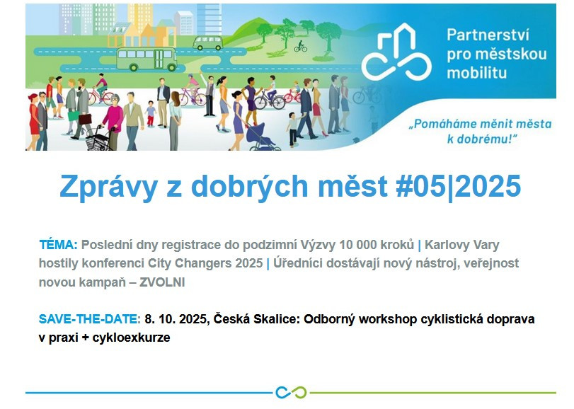 TÉMA: Spouštíme registraci na konferenci CityChangers 2025 | Tleskáme Pelhřimovu | Vítězná města dubnové Výzvy 10 000 kroků | "Kdo je aktivní, ten září." | Putovní výstava cestuje po ČR | Školní ulice: vytvořme bezpečné cesty do škol! | Nadcházející akce